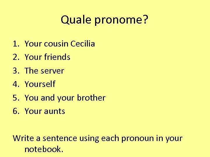 Quale pronome? 1. 2. 3. 4. 5. 6. Your cousin Cecilia Your friends The server Yourself You and your brother Your aunts Write a sentence using each pronoun in your notebook.