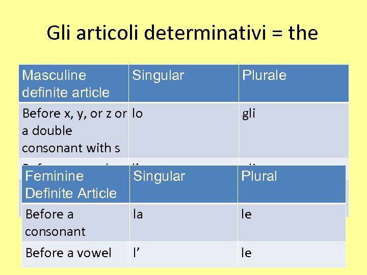 Gli articoli determinativi = the Masculine Singular definite article Before x, y, or z or lo a double consonant with s Before a vowel l’ Feminine Singular Before a single il Definite Article consonant Before a la consonant Before a vowel l’ Plurale gli Plural i le le