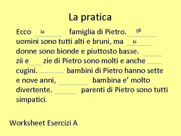La pratica gli la Ecco famiglia di Pietro. le uomini sono tutti alti e bruni, ma donne sono bionde e piuttosto basse. zii e zie di Pietro sono molti e anche cugini. bambini di Pietro hanno sette e nove anni, bambina e’ molto divertente. parenti di Pietro sono tutti simpatici. Worksheet Esercizi A