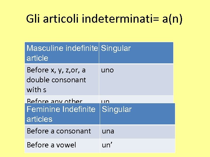 Gli articoli indeterminati= a(n) Masculine indefinite Singular article Before x, y, z, or, a uno double consonant with s Before any other un Feminine Indefinite Singular consonant or vowel articles Before a consonant una Before a vowel un’