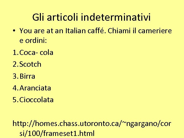 Gli articoli indeterminativi • You are at an Italian caffé. Chiami il cameriere e ordini: 1. Coca- cola 2. Scotch 3. Birra 4. Aranciata 5. Cioccolata http: //homes. chass. utoronto. ca/~ngargano/cor si/100/frameset 1. html