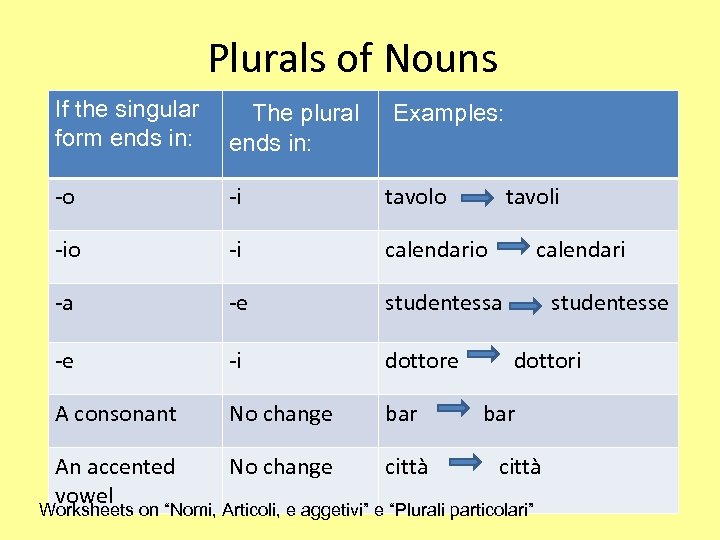 Plurals of Nouns If the singular The plural Examples: form ends in: -o -i tavolo tavoli -io -i calendario calendari -a -e studentessa studentesse -e -i dottore dottori A consonant No change bar An accented vowel No change città Worksheets on “Nomi, Articoli, e aggetivi” e “Plurali particolari”