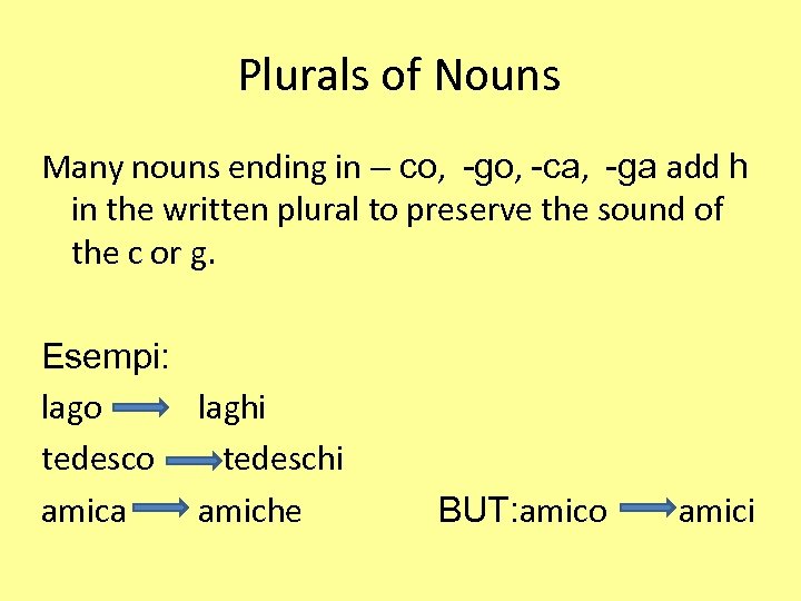 Plurals of Nouns Many nouns ending in – co, -go, -ca, -ga add h in the written plural to preserve the sound of the c or g. Esempi: lago laghi tedesco tedeschi amica amiche BUT: amico amici