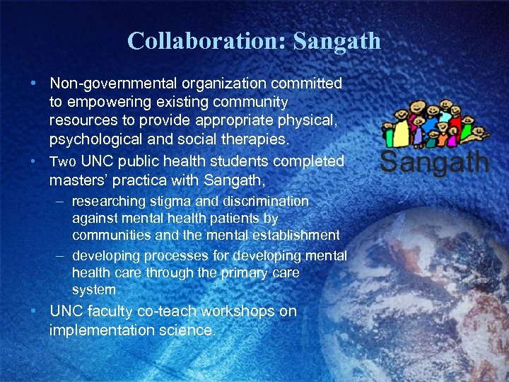 Collaboration: Sangath • Non-governmental organization committed to empowering existing community resources to provide appropriate physical, psychological and social therapies. • Two UNC public health students completed masters’ practica with Sangath, – researching stigma and discrimination against mental health patients by communities and the mental establishment – developing processes for developing mental health care through the primary care system • UNC faculty co-teach workshops on implementation science.
