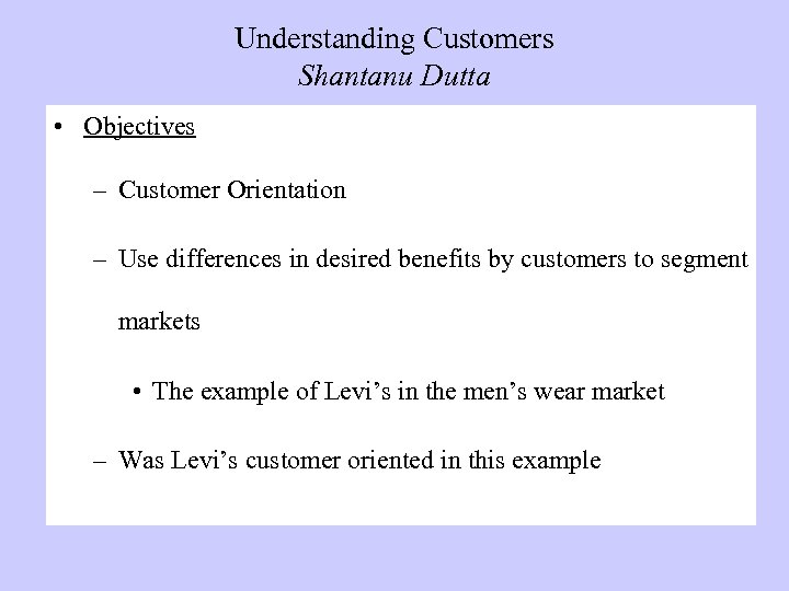 Understanding Customers Shantanu Dutta • Objectives – Customer Orientation – Use differences in desired benefits by customers to segment markets • The example of Levi’s in the men’s wear market – Was Levi’s customer oriented in this example