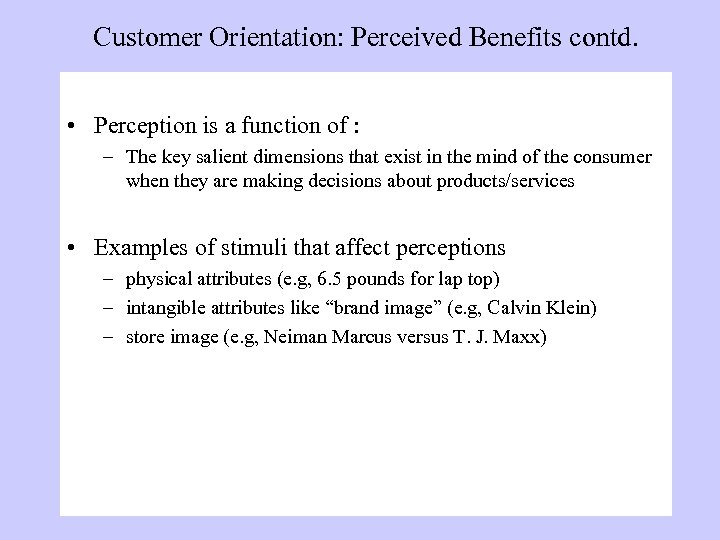 Customer Orientation: Perceived Benefits contd. • Perception is a function of : – The key salient dimensions that exist in the mind of the consumer when they are making decisions about products/services • Examples of stimuli that affect perceptions – physical attributes (e. g, 6. 5 pounds for lap top) – intangible attributes like “brand image” (e. g, Calvin Klein) – store image (e. g, Neiman Marcus versus T. J. Maxx)