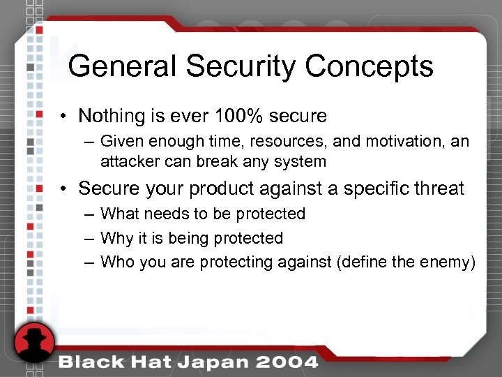 General Security Concepts • Nothing is ever 100% secure – Given enough time, resources, and motivation, an attacker can break any system • Secure your product against a specific threat – What needs to be protected – Why it is being protected – Who you are protecting against (define the enemy)