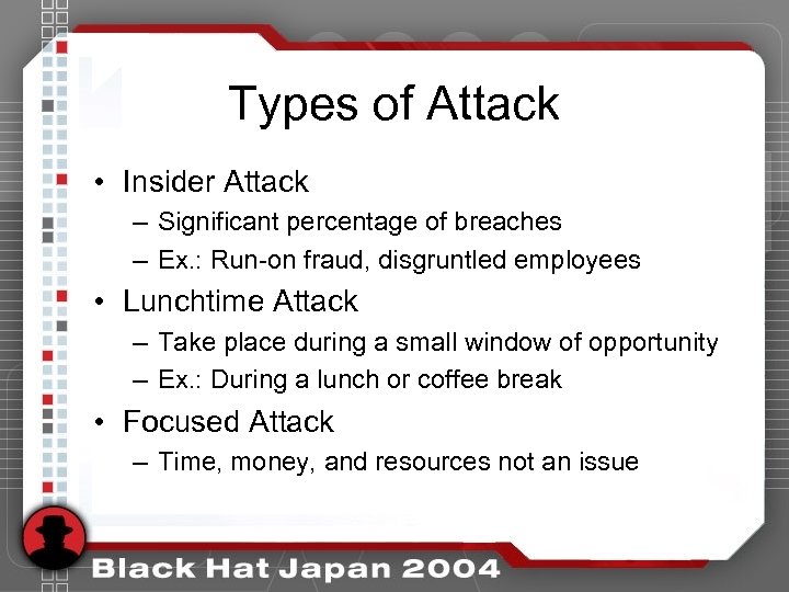 Types of Attack • Insider Attack – Significant percentage of breaches – Ex. : Run-on fraud, disgruntled employees • Lunchtime Attack – Take place during a small window of opportunity – Ex. : During a lunch or coffee break • Focused Attack – Time, money, and resources not an issue