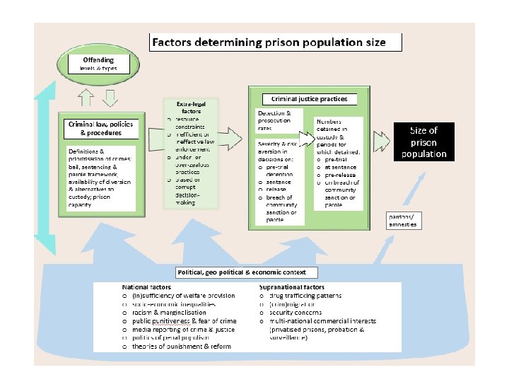 Understanding trends in imprisonment • Criminal justice practices: – numbers detained & for how long – severity & risk aversion in decision-making – detection & prosecution rates • Offending levels • Criminal law & CJ policies, procedures: – define ‘offences’ & those to be prioritised – set criteria for decision-making on custody – set framework of custodial provision & alternatives • Extra-legal factors • Political, geo-political & economic context