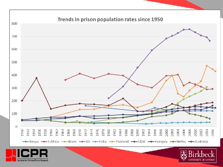 Global context of 10 -country project • 11 m+ prisoners worldwide • About 3 m of whom are in pretrial detention/remand. • About 2. 2 m are in US prisons • Vast disparities in prison pop. rates & trends • But rapid, unrelenting growth in imprisonment in much of the world in recent decades.