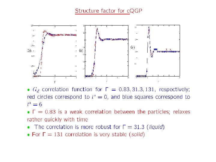 short transport summary log(inverse viscosity s/eta)- vs. log(inverse heavy q diffusion const D*2 pi. T) (avoids messy discussion of couplings) ->Stronger coupled -> • RHIC data: very small viscosity and diffusion • vs theory Ad. S/CFT and our MD Most perfect liquid 4 pi MD results, with specified monopole fraction Weak coupling end => (Perturbative results shown here) Both related to mean free path 50 -50% E/M is the most ideal liquid