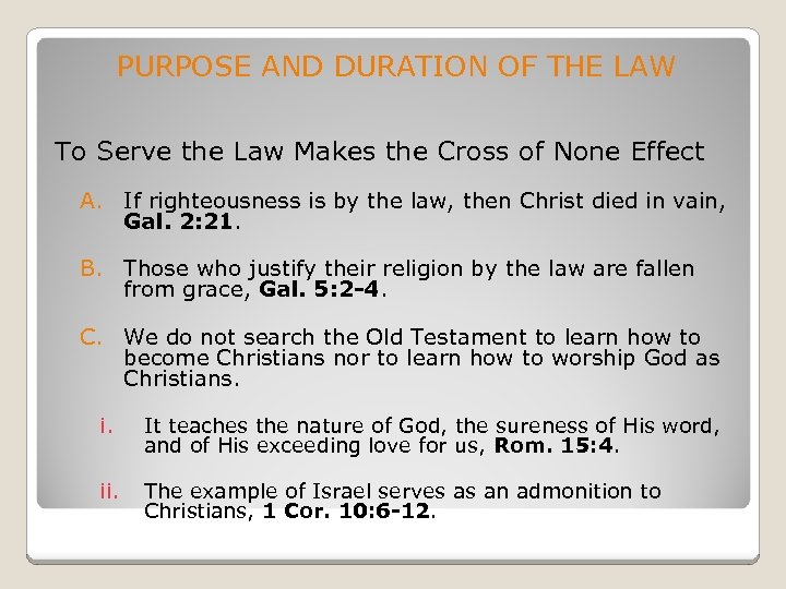 PURPOSE AND DURATION OF THE LAW To Serve the Law Makes the Cross of None Effect A. If righteousness is by the law, then Christ died in vain, Gal. 2: 21. B. Those who justify their religion by the law are fallen from grace, Gal. 5: 2 -4. C. We do not search the Old Testament to learn how to become Christians nor to learn how to worship God as Christians. i. It teaches the nature of God, the sureness of His word, and of His exceeding love for us, Rom. 15: 4. ii. The example of Israel serves as an admonition to Christians, 1 Cor. 10: 6 -12.