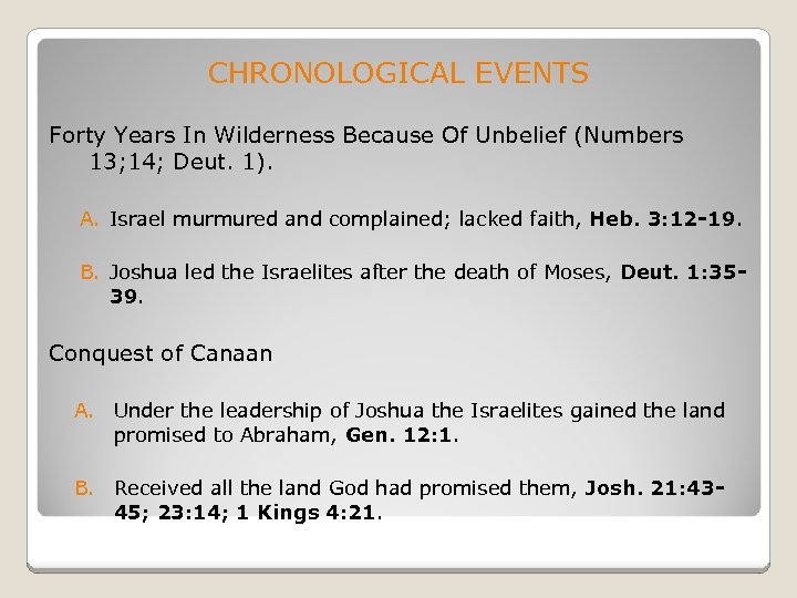 CHRONOLOGICAL EVENTS Forty Years In Wilderness Because Of Unbelief (Numbers 13; 14; Deut. 1). A. Israel murmured and complained; lacked faith, Heb. 3: 12 -19. B. Joshua led the Israelites after the death of Moses, Deut. 1: 3539. Conquest of Canaan A. Under the leadership of Joshua the Israelites gained the land promised to Abraham, Gen. 12: 1. B. Received all the land God had promised them, Josh. 21: 4345; 23: 14; 1 Kings 4: 21.