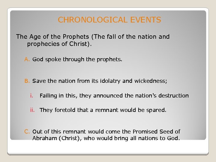 CHRONOLOGICAL EVENTS The Age of the Prophets (The fall of the nation and prophecies of Christ). A. God spoke through the prophets. B. Save the nation from its idolatry and wickedness; i. Failing in this, they announced the nation's destruction ii. They foretold that a remnant would be spared. C. Out of this remnant would come the Promised Seed of Abraham (Christ), who would bring all nations to God.