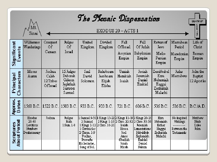 SIGNIFICANT FACTS Name A. This period is named after Moses, for it was through him God delivered the law to the Jews. Duration A. This age begins with the giving of the Ten Commandments at Mt. Sinai and lasts until the death of Christ, a span of about 1500 years. B. The Bible record of this period may be read from Exodus 20 through Acts 1.