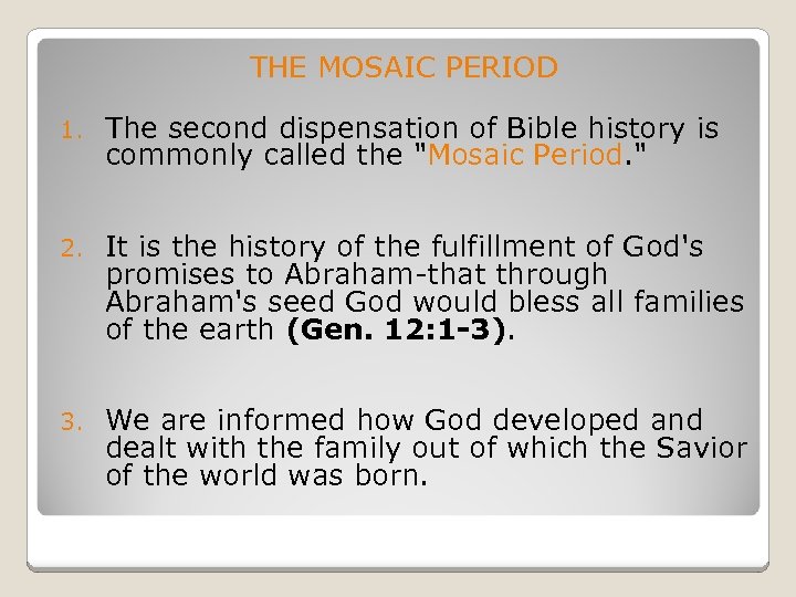 THE MOSAIC PERIOD 1. The second dispensation of Bible history is commonly called the "Mosaic Period. " 2. It is the history of the fulfillment of God's promises to Abraham-that through Abraham's seed God would bless all families of the earth (Gen. 12: 1 -3). 3. We are informed how God developed and dealt with the family out of which the Savior of the world was born.
