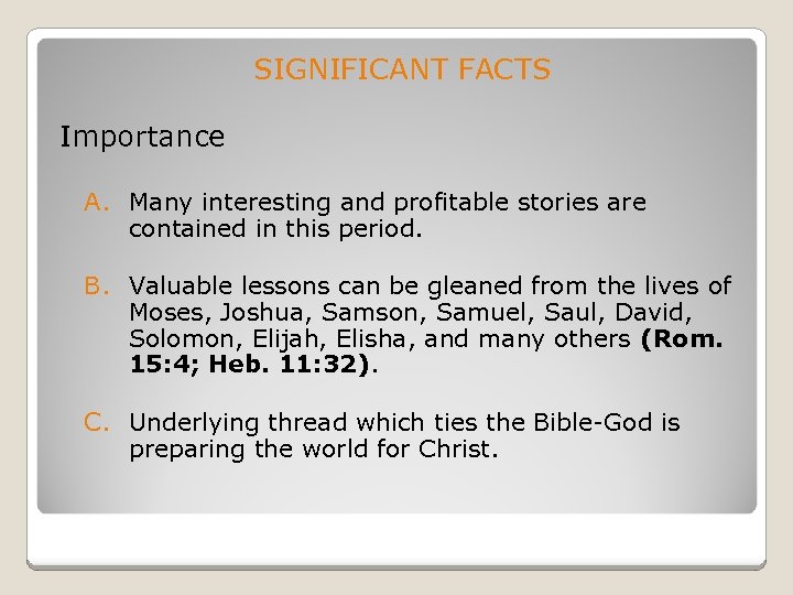 SIGNIFICANT FACTS Importance A. Many interesting and profitable stories are contained in this period. B. Valuable lessons can be gleaned from the lives of Moses, Joshua, Samson, Samuel, Saul, David, Solomon, Elijah, Elisha, and many others (Rom. 15: 4; Heb. 11: 32). C. Underlying thread which ties the Bible-God is preparing the world for Christ.