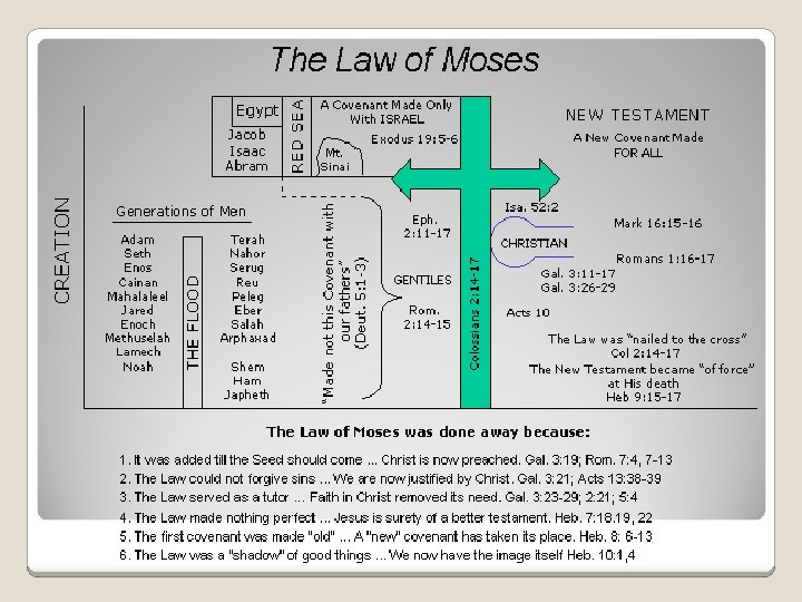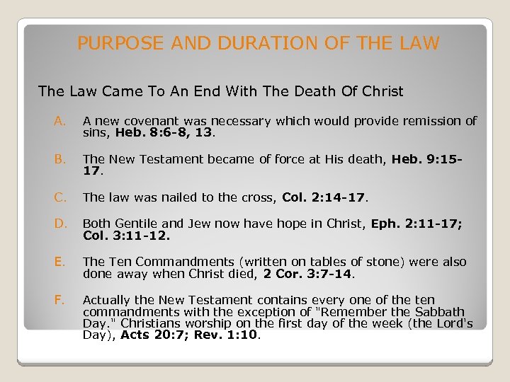 PURPOSE AND DURATION OF THE LAW The Law Came To An End With The Death Of Christ A. A new covenant was necessary which would provide remission of sins, Heb. 8: 6 -8, 13. B. The New Testament became of force at His death, Heb. 9: 1517. C. The law was nailed to the cross, Col. 2: 14 -17. D. Both Gentile and Jew now have hope in Christ, Eph. 2: 11 -17; Col. 3: 11 -12. E. The Ten Commandments (written on tables of stone) were also done away when Christ died, 2 Cor. 3: 7 -14. F. Actually the New Testament contains every one of the ten commandments with the exception of "Remember the Sabbath Day. " Christians worship on the first day of the week (the Lord's Day), Acts 20: 7; Rev. 1: 10.