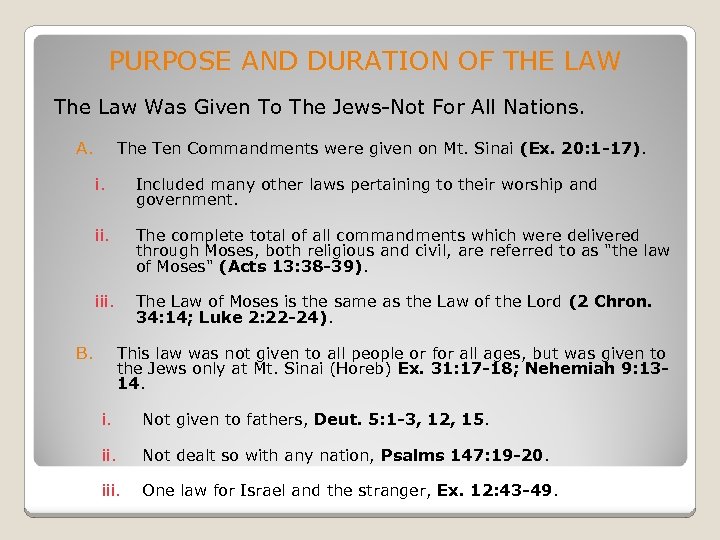 PURPOSE AND DURATION OF THE LAW The Law Was Given To The Jews-Not For All Nations. A. The Ten Commandments were given on Mt. Sinai (Ex. 20: 1 -17). i. Included many other laws pertaining to their worship and government. ii. The complete total of all commandments which were delivered through Moses, both religious and civil, are referred to as "the law of Moses" (Acts 13: 38 -39). iii. The Law of Moses is the same as the Law of the Lord (2 Chron. 34: 14; Luke 2: 22 -24). B. This law was not given to all people or for all ages, but was given to the Jews only at Mt. Sinai (Horeb) Ex. 31: 17 -18; Nehemiah 9: 1314. i. Not given to fathers, Deut. 5: 1 -3, 12, 15. ii. Not dealt so with any nation, Psalms 147: 19 -20. iii. One law for Israel and the stranger, Ex. 12: 43 -49.