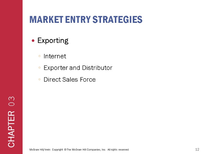 Market Entry Strategies Exporting Internet Exporter and Distributor Direct Sales Force McGraw Hill/Irwin Copyright © The McGraw Hill Companies, Inc. All rights reserved 12