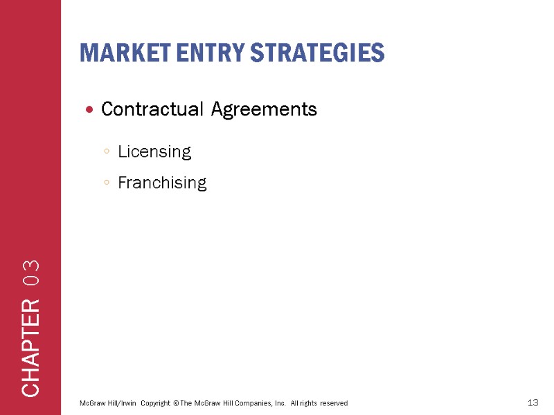 Market Entry Strategies Contractual Agreements Licensing Franchising McGraw Hill/Irwin Copyright © The McGraw Hill Companies, Inc. All rights reserved 13