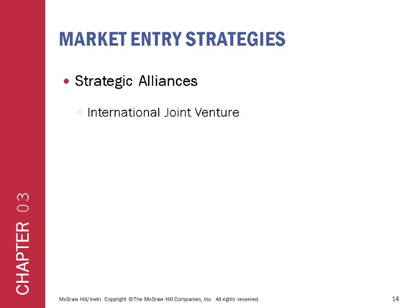 Market Entry Strategies Strategic Alliances International Joint Venture McGraw Hill/Irwin Copyright © The McGraw Hill Companies, Inc. All rights reserved 14
