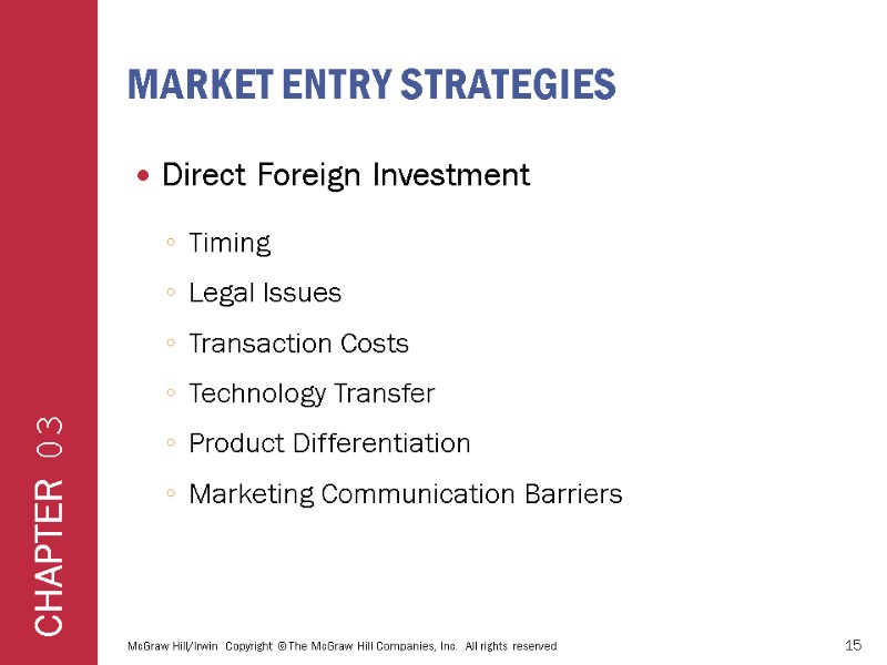 Market Entry Strategies Direct Foreign Investment Timing Legal Issues Transaction Costs Technology Transfer Product Differentiation Marketing Communication Barriers McGraw Hill/Irwin Copyright © The McGraw Hill Companies, Inc. All rights reserved 15