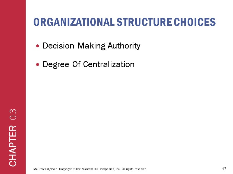 Organizational Structure Choices Decision Making Authority Degree Of Centralization McGraw Hill/Irwin Copyright © The McGraw Hill Companies, Inc. All rights reserved 17