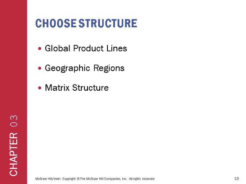 Choose Structure Global Product Lines Geographic Regions Matrix Structure McGraw Hill/Irwin Copyright © The McGraw Hill Companies, Inc. All rights reserved 18