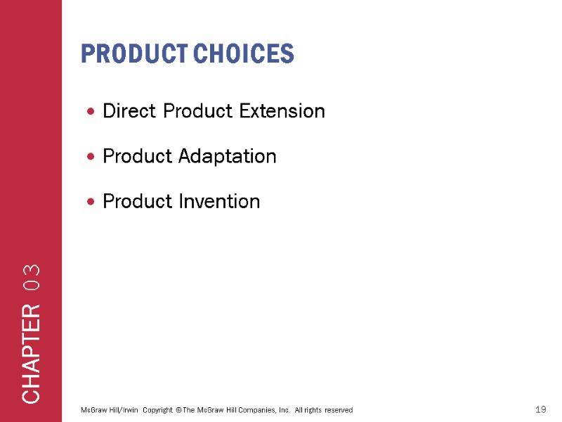 Product Choices Direct Product Extension Product Adaptation Product Invention McGraw Hill/Irwin Copyright © The McGraw Hill Companies, Inc. All rights reserved 19