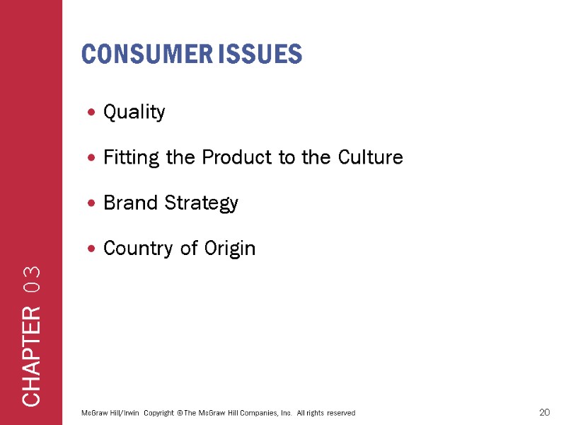Consumer Issues Quality Fitting the Product to the Culture Brand Strategy Country of Origin McGraw Hill/Irwin Copyright © The McGraw Hill Companies, Inc. All rights reserved 20
