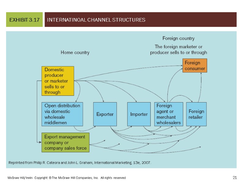 INTERNATINOAL Channel Structures EXHIBIT 3.17 McGraw Hill/Irwin Copyright © The McGraw Hill Companies, Inc. All rights reserved 21 Reprinted from Philip R. Cateora and John L. Graham, International Marketing, 13e, 2007.
