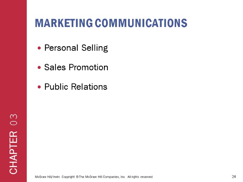 Marketing Communications Personal Selling Sales Promotion Public Relations McGraw Hill/Irwin Copyright © The McGraw Hill Companies, Inc. All rights reserved 24