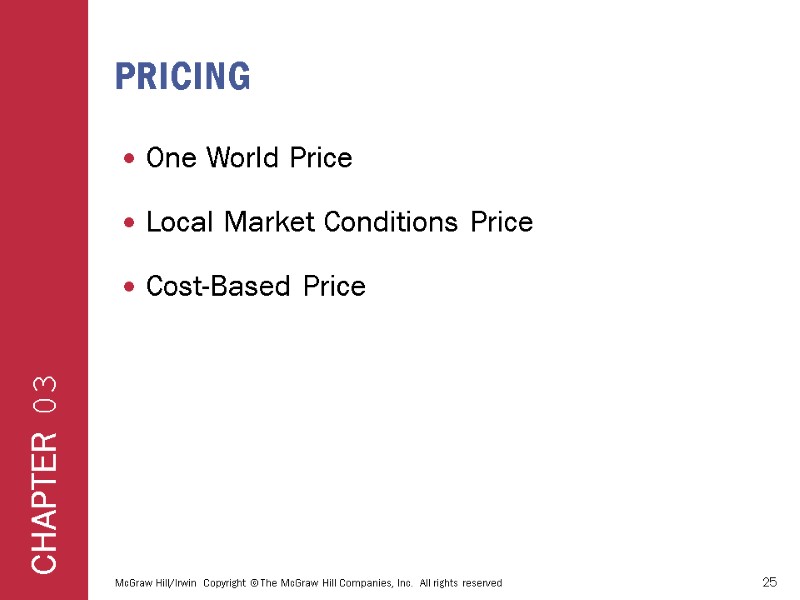 Pricing One World Price Local Market Conditions Price Cost-Based Price McGraw Hill/Irwin Copyright © The McGraw Hill Companies, Inc. All rights reserved 25