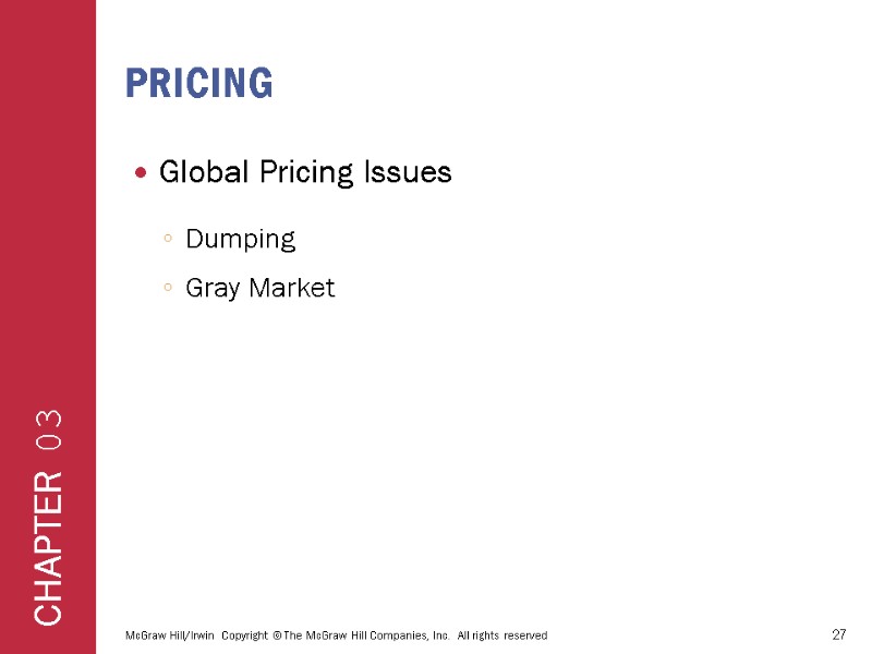 Pricing Global Pricing Issues Dumping Gray Market McGraw Hill/Irwin Copyright © The McGraw Hill Companies, Inc. All rights reserved 27
