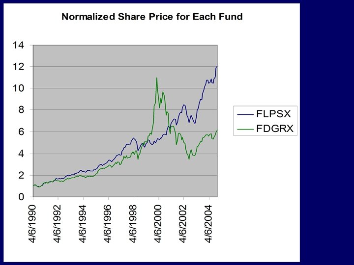 The following graph provides a comparison of two actively-managed mutual funds that are representative of the performance of actively managed funds that can be characterized as Large. Cap Growth versus Small and Mid-Cap Value for a 15 -year period beginning in 1990. The Large-Cap Growth fund is Fidelity Growth Company (FDGRX) and the Small and Mid-Cap Value fund is Fidelity Low-Priced (FLPSX). Share prices for both have been normalized to $1 a share for both funds at the start of the period.