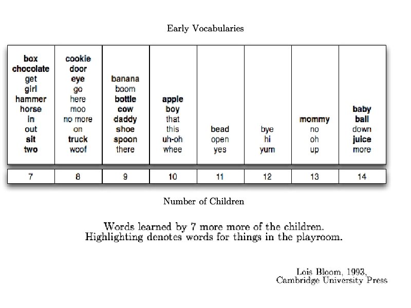 Language Development in Children • 0 -3 mo: prefers sounds in native language • 3 -6 mo: imitation of vowel sounds only • 6 -8 mo: babbling in consonant-vowel segments • 8 -10 mo: word comprehension, starts to lose sensitivity to consonants outside native language • 12 -13 mo: word production (naming) • 16 -20 mo: word combinations, relational words (verbs, adj. ) • 24 -36 mo: grammaticization, inflectional morphology • 3 years – adulthood: vocab. growth, sentence-level grammar for discourse purposes