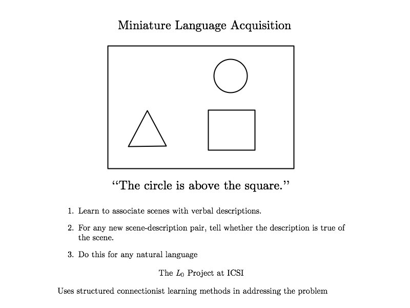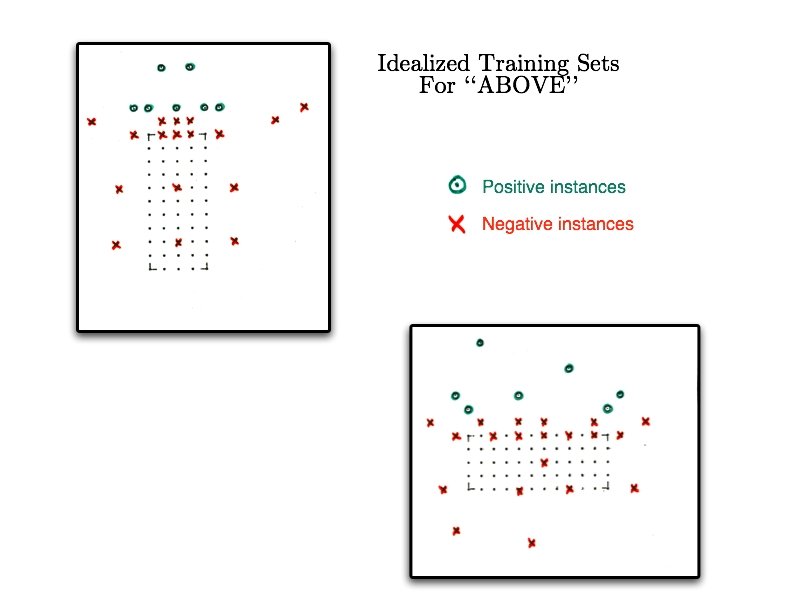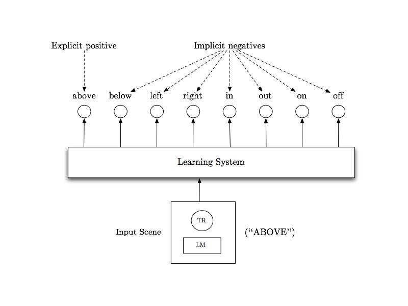 Issue #1: Implicit Negatives • • • Children usually do not get explicit negatives But we won’t know when to stop generalizing if we don’t have negative evidence Yet spatial relation terms aren’t entirely mutually exclusive The same scene can often be described with two or more spatial relation terms (e. g. above and outside) How can we make the learning problem realistic yet learnable?