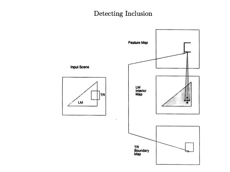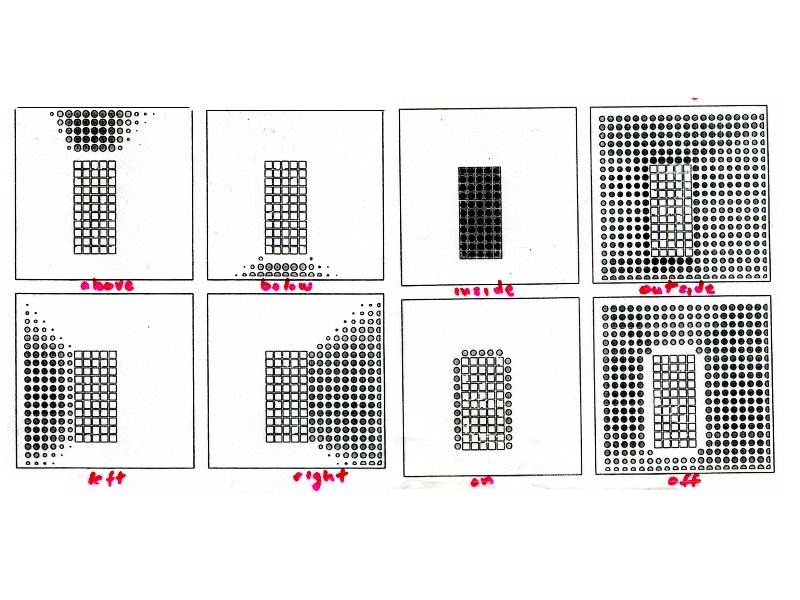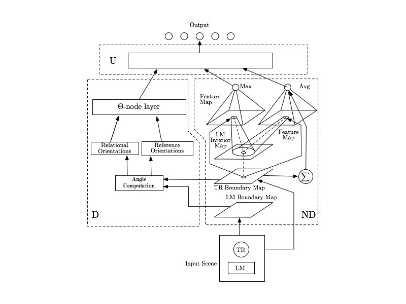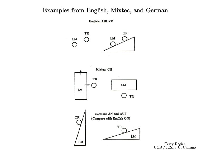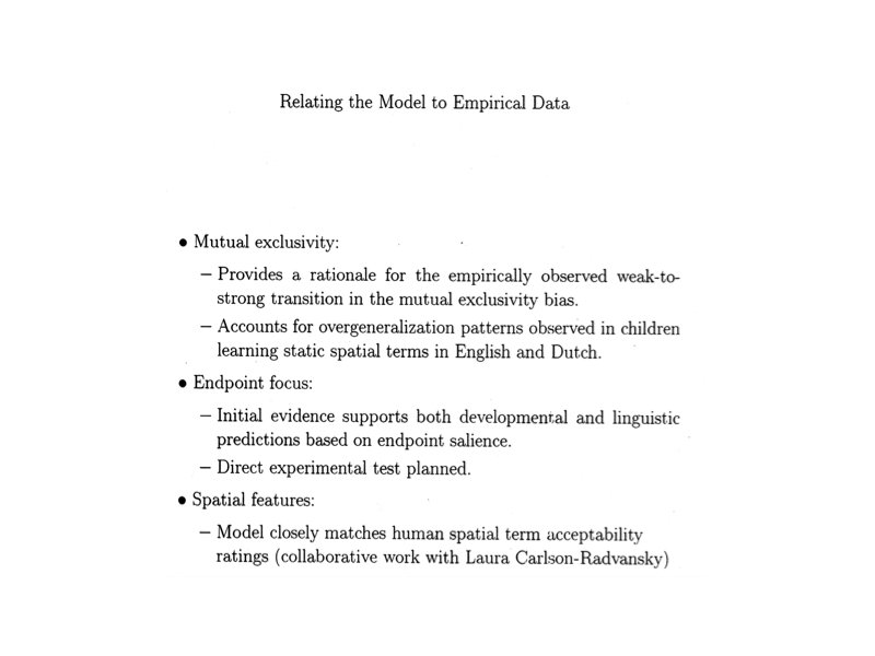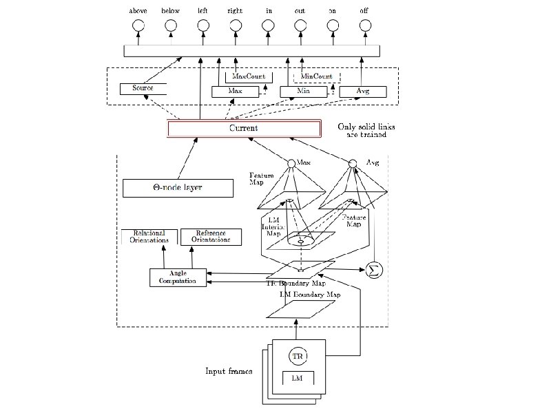 Regier’s Model above below left right in out on off Learning System Input: TR LM above • Training input: configuration of TR/LM and the correct spatial relation term • Learned behavior: input TR/LM, output spatial relation