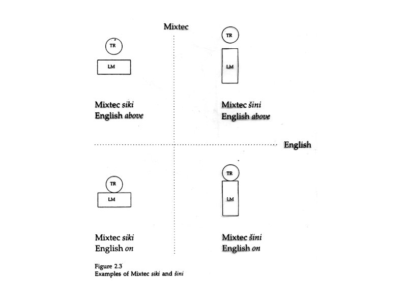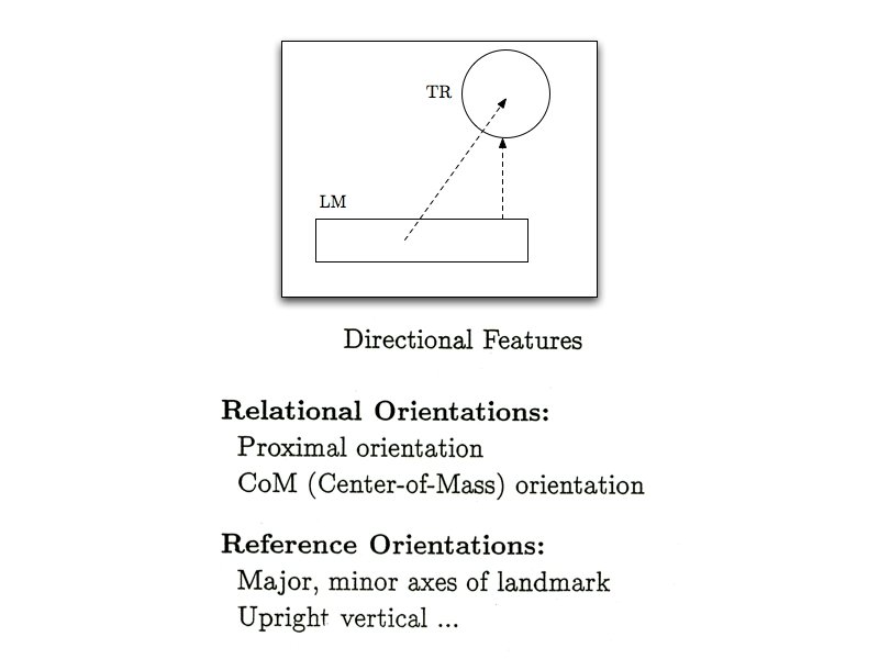 Spatial schemas • TR/LM relation • Boundaries, bounded region • Topological relations • Orientational Axes • Proximal/Distal