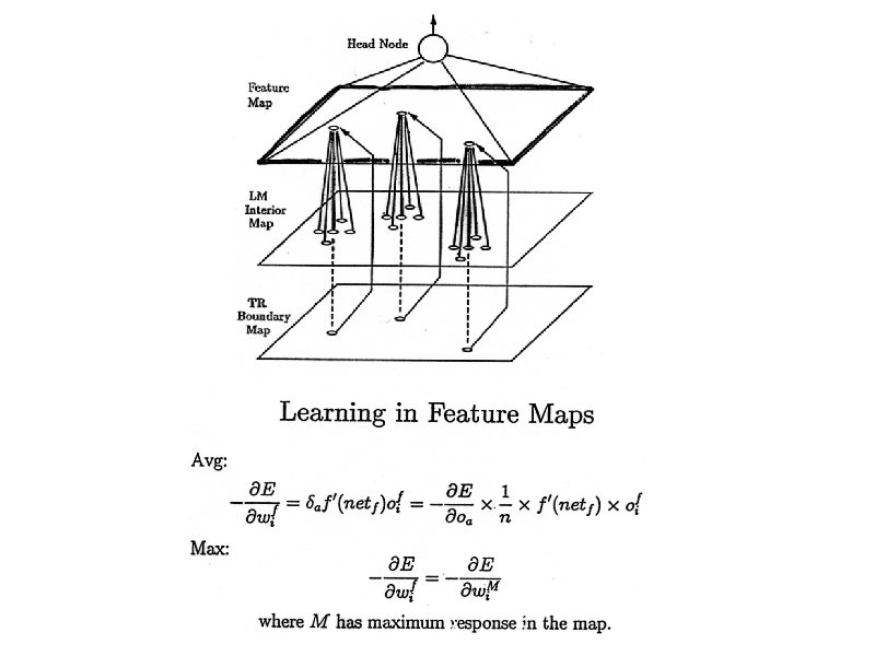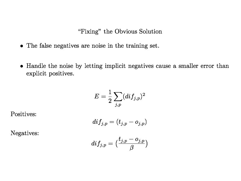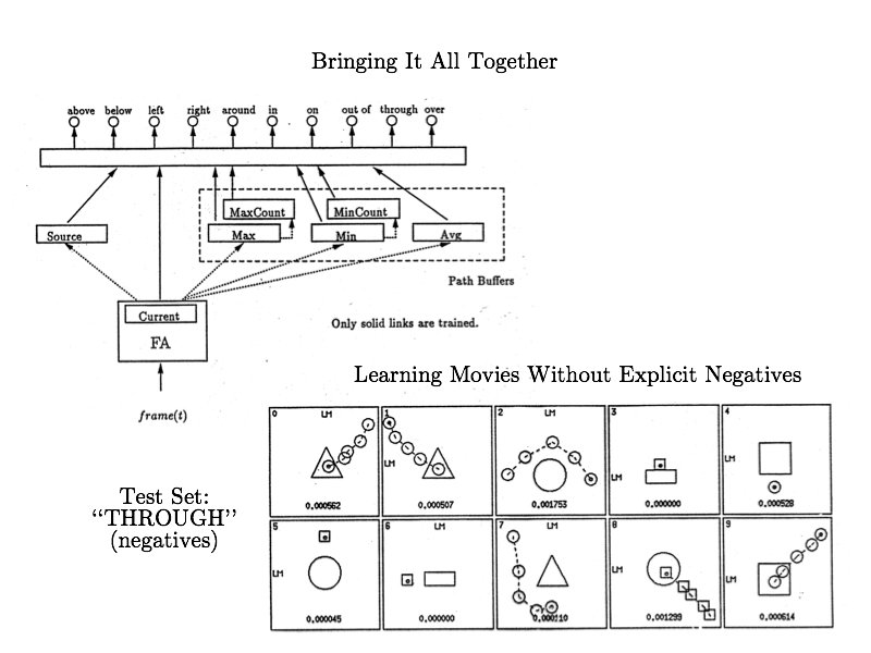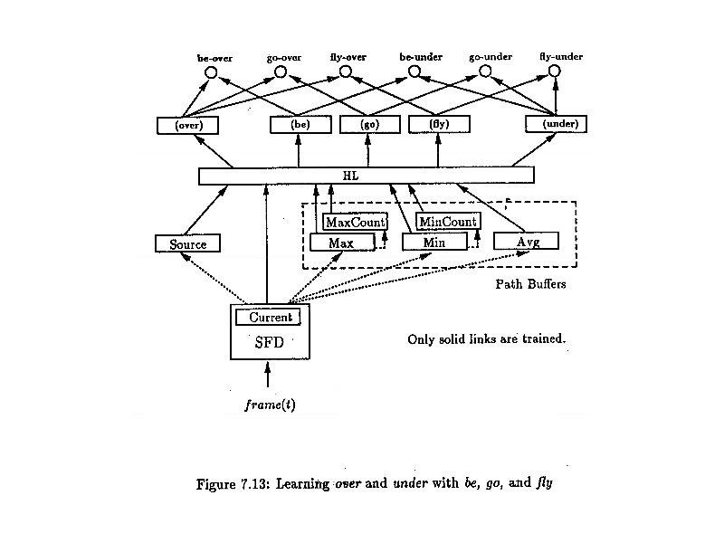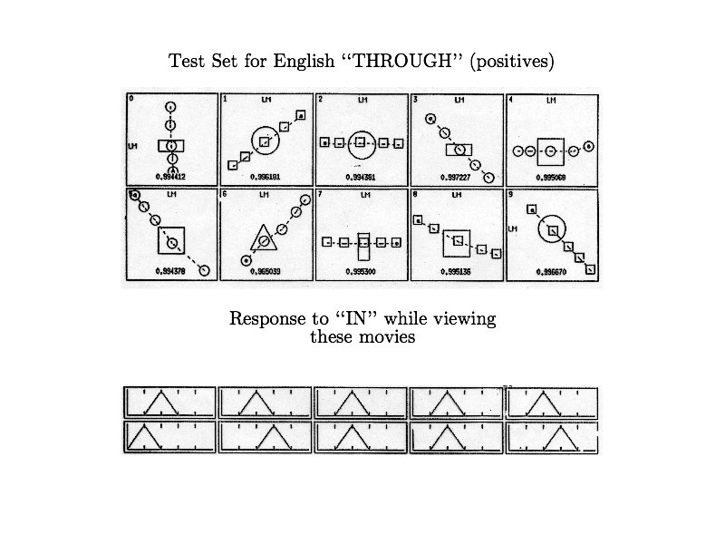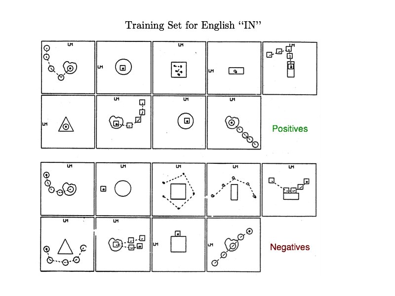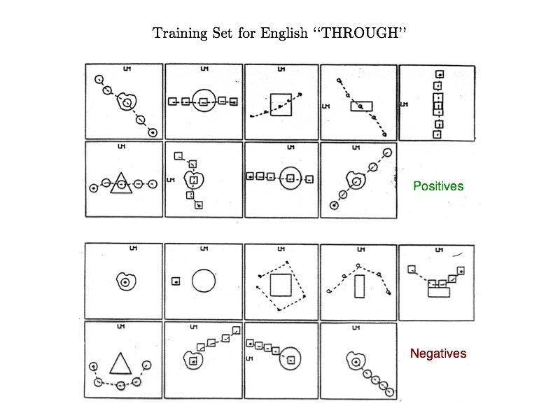 Dealing with Implicit Negatives • • • Explicit positive for above Implicit negatives for below, left, right, etc in Regier: E = ½ ∑i, p (( ti, p – oi, p) * βi, p )2, where i is the node, p is the pattern, βi, p = 1 if explicit positive, βi, p < 1 if implicit negative