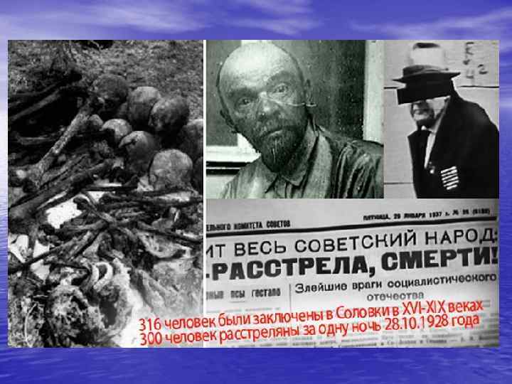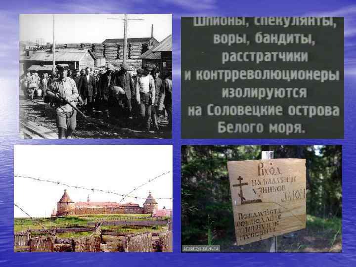 • С конца XVI века — место ссылки противников политического строя и официального православия. С этого времени монастырь стал местом, которое держало в страхе всю Россию. С 1920—х гг. здесь был лагерь особого назначения, в том числе для политических заключенных. Эти годы стали одними из самых страшных в истории русского народа — были убиты тысячи неповинных людей. Встреча новоприбывших заключенных, всегда начиналась с речи: «Имейте в виду, здесь нет Советской власти. Здесь власть – соловецкая» . За первые семь лет существования Соловецких лагерей число заключенных увеличилось с 3 тысяч до 60 тысяч.
