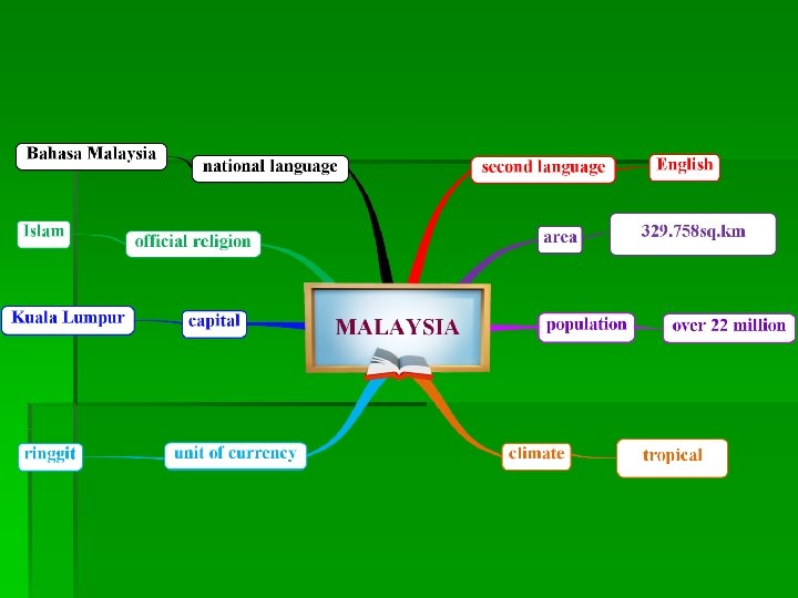 . Fill in the table: 1. 2. 3. 4. 5. 6. 7. 8. Area: 329, 758 sq km Population: Over 22 million Tropical climate Climate: Unit of currency: The ringgit Kuala Lumpur Capital city: Official religion: Islam National language: Bahasa Malaysia English Compulsory second language: