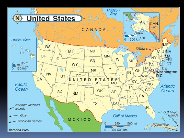 The United States of America - early history in brief 1773 – The Boston Tea Party: an act of rebellion against British rule (taxes but no representation in the Parliament) 1775– 1783 - American Revolutionary War: War of independence fought between Great Britain and the 13 British colonies on the eastern seaboard of North America 1776 Declaration of Independence adopted in Philadelphia (July 4) 1777 Articles of Confederation, the first U. S. constitution adopted – a weak CONFEDERAL government 1783 – Treaty of Paris - Great Britain formally acknowledges American independence 1787 Constitutional Convention, made up of delegates from 12 of the original 13 colonies, meets in Philadelphia to draft the U. S. Constitution – a strong national FEDERAL government with powers of taxation - 1789 George Washington is unanimously elected president of the United States U. S. Constitution - ratified by nine states 1791 First ten amendments to the Constitution, known as the Bill of Rights, are ratified 1861 -1865 Civil War: Conflict between the North (the Union) and the South (the Confederacy) over the expansion of slavery into western states