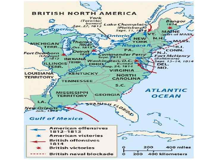 War of 1812 • June 1812, Congress declared war on Britain – First time war is declared as a new nation • Fighting would last 2 years – Americans tried to invade Canada; failed • Battle of Bladensburg left Washington D. C. unprotected (1814) – British forces went to the nation’s capital, burned down the President’s mansion and the Capital.