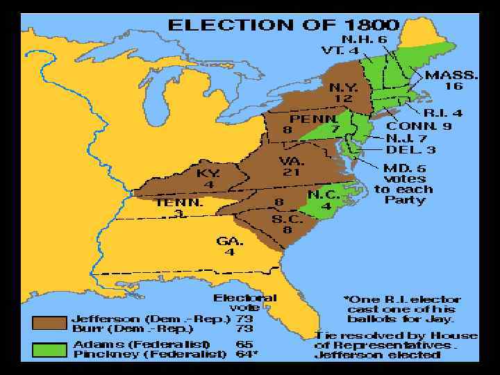 Election of 1800 cont… • Jefferson and Burr elected, however it was a tie. – The House of Reps. made up of primarily Federalists – Multiple ballots cast and decided on Jefferson over Burr in the end. – Alexander Hamilton convinced many to support Jefferson over Burr • Stating Jefferson was the lesser of the two evils – Burr was angry, challenged Hamilton to a duel and Hamilton was killed in 1804. – Jefferson, 3 rd President