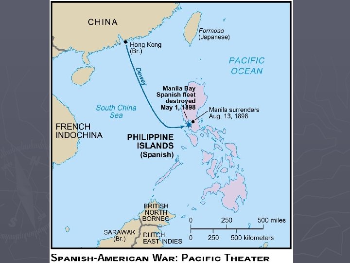 War in the Pacific ► Spain expected first attack to be in Cuba ► American Pacific fleet steams to the Philippines § Strong steel navy (Mahan) § Led by Commodore George Dewey ► US fleet defeats Spanish fleet in Manila Bay on May 1 st, 1898