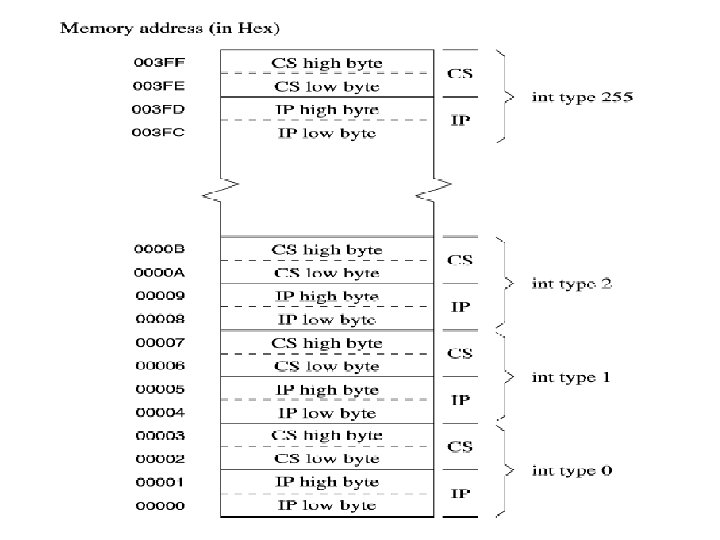 8086 INTERRUPT TYPES 256 INTERRUPTS OF 8086 ARE DIVIDED IN TO 3 GROUPS 1. TYPE 0 TO TYPE 4 INTERRUPTSTHESE ARE USED FOR FIXED OPERATIONS AND HENCE ARE CALLED DEDICATED INTERRUPTS 2. TYPE 5 TO TYPE 31 INTERRUPTS NOT USED BY 8086, RESERVED FOR HIGHER PROCESSORS LIKE 80286 80386 ETC 3. TYPE 32 TO 255 INTERRUPTS AVAILABLE FOR USER, CALLED USER DEFINED INTERRUPTS THESE CAN BE H/W INTERRUPTS AND ACTIVATED THROUGH INTR LINE OR CAN BE S/W INTERRUPTS