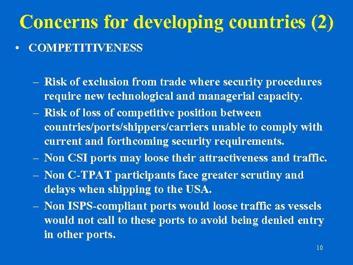 Concerns for developing countries (1) • ADDITIONAL TRANSPORT COSTS: – Transhipment costs: to ship to the USA, systematic use of CSI ports may entail additional transhipment operations. – Increased freight rates: carriers levy fees to cover extra security costs. • ADDITIONAL OPERATIONAL COSTS: – ISPS Code implementation: estimated costs for developing country ship owners: USD 300 million (assuming that 28 % of world fleet controlled by developing countries) – Estimated costs for developing country ports to implement security plans: USD 1 -2 billion (UNCTAD estimate based on US Coast Guard estimation of $7 billion for US ports) – Implementation of security guidelines for shippers and other parties all along the supply chain (e. g. C-TPAT) 9