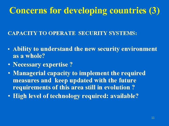 Concerns for developing countries (2) • COMPETITIVENESS – Risk of exclusion from trade where security procedures require new technological and managerial capacity. – Risk of loss of competitive position between countries/ports/shippers/carriers unable to comply with current and forthcoming security requirements. – Non CSI ports may loose their attractiveness and traffic. – Non C-TPAT participants face greater scrutiny and delays when shipping to the USA. – Non ISPS-compliant ports would loose traffic as vessels would not call to these ports to avoid being denied entry in other ports. 10